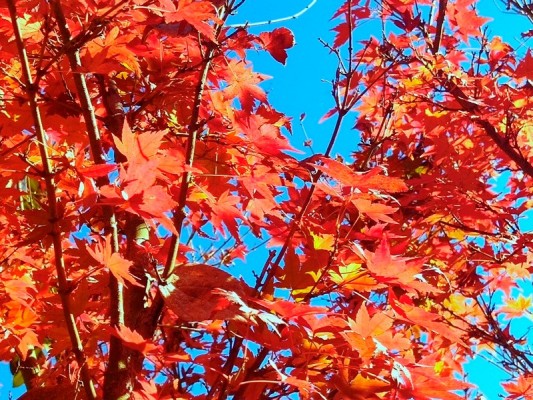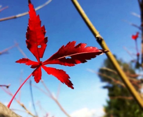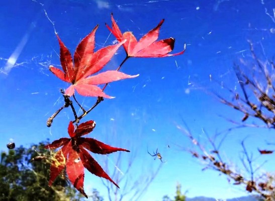 寒冬腊月,万物萧条,被霜染得火红的枫叶,像一簇簇红花、一团团火焰、一面面彩旗,随风舞动,把小城装扮得生机勃勃、艳丽多姿。火红的枫叶在寒风里显得那么淡定从容,仿佛要用生命里最后的色彩点燃人们的希望,鼓励人们去努力、去拼搏、去奋斗……(杨成菊 摄)